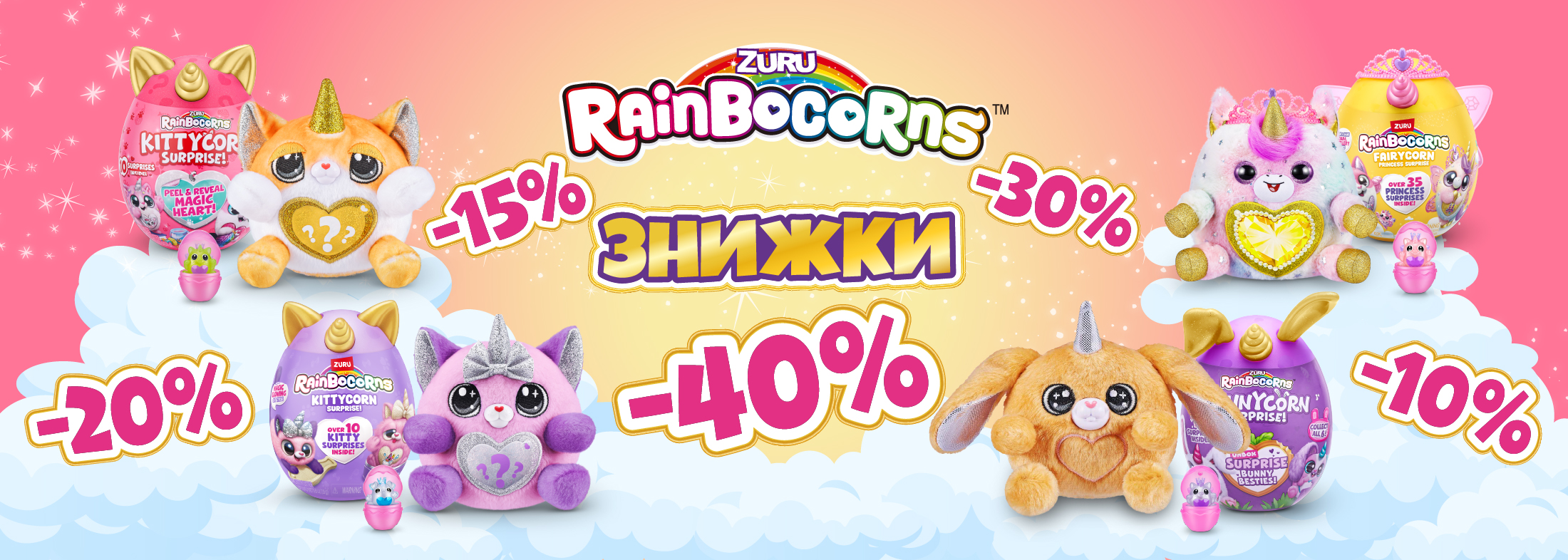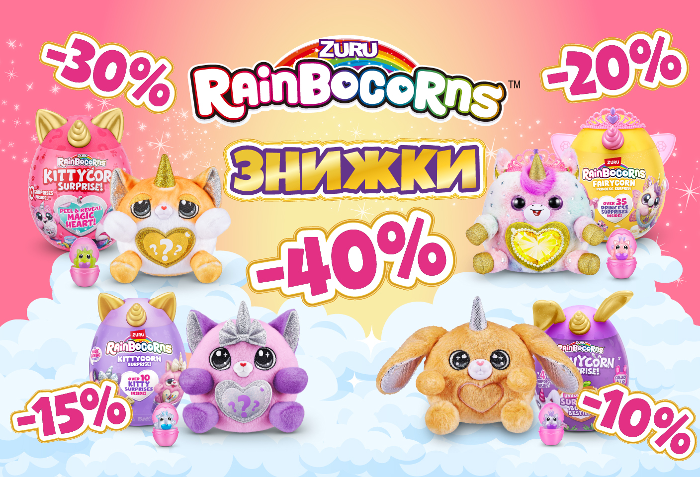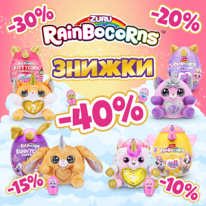 Акция действует с 01.04.2024 по 30.04.2024, исключительно в магазинах сети «Будынок Играшок». Под фразой «Вращай колесо скидок от Rainbocorns и получи скидку на кассе до 40%» следует понимать при оформлении покупки любого товара скидоку получит 1 (один) из 4800 (четырех тысяч восьмисот) уникальных акционных промокодов с указанной скидкой от 10% до 40% на весь ассортимент TM Rainbocorns. Для применения скидки в момент проведения расчетной кассовой операции покупатель должен предъявить безошибочно и в правильном порядке все символы акционного уникального промокода. 1 (один) уникальный акционный промокод применяется на 1 (один) товар с ТМ Rainbocorns и не распространяется на другие товары ТМ Rainbocorns, имеющиеся в том же чеке. Покупатель имеет право самостоятельно выбрать на какой именно товар из чека ТМ Rainbocorns будет распространяться скидка. Скидка с указанным процентом может быть использована с 1 апреля по 30 апреля 2024 года. Уникальный акционный промокод действует только один раз при совершении покупки и не может применяться для получения скидки на следующие покупки.